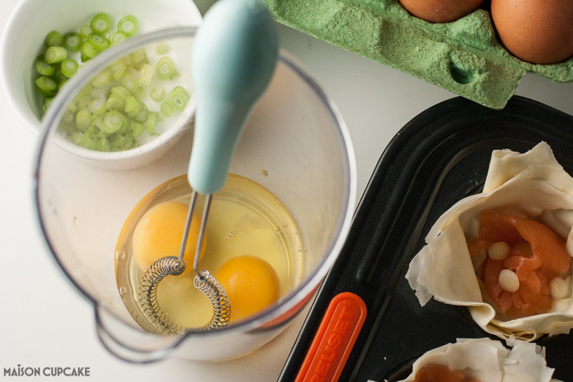 Slice up some spring onions, arrange these in the filo cases with a strip of smoked salmon. In a jug beat some British Lion Eggs with half fat creme fraiche.