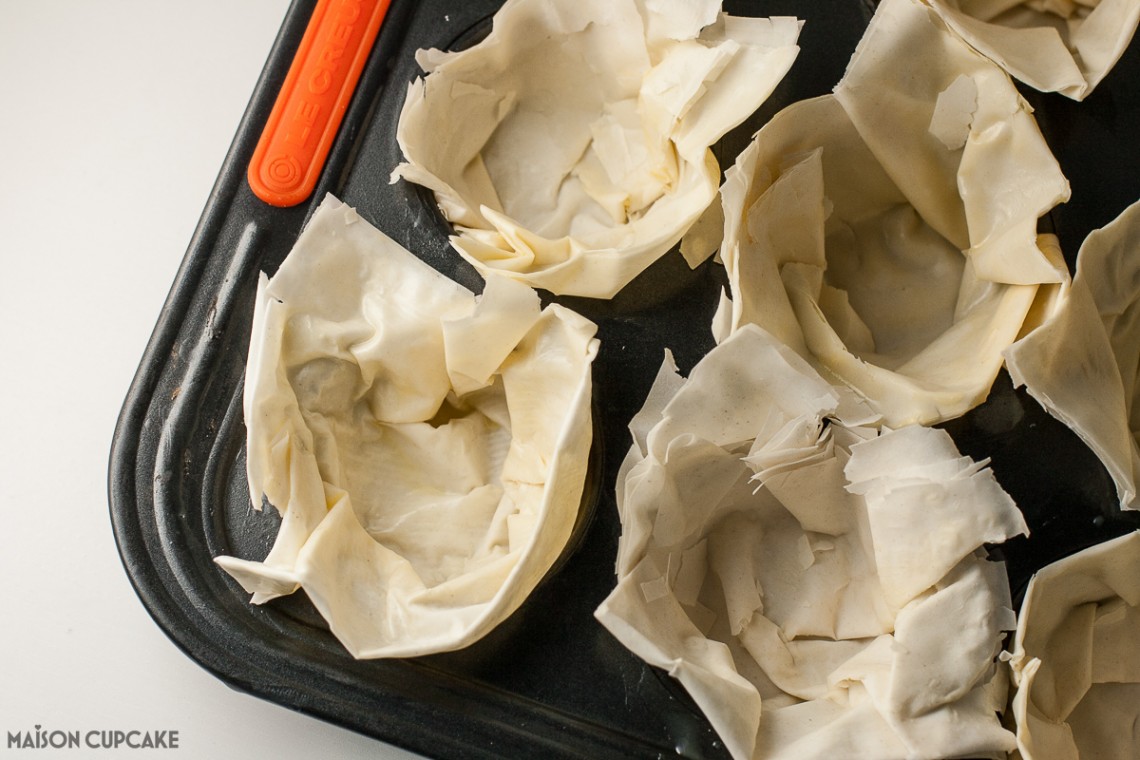 Paint each sheet of filo with butter and fold into quarters, trim to a square shape and set the off cuts aside. Mould each square of filo into the hole of a well greased 12 bun tin and carry on painting as you go. I am using a metal muffin tin but this silicone muffin pan (affiliate link) is a good sub.