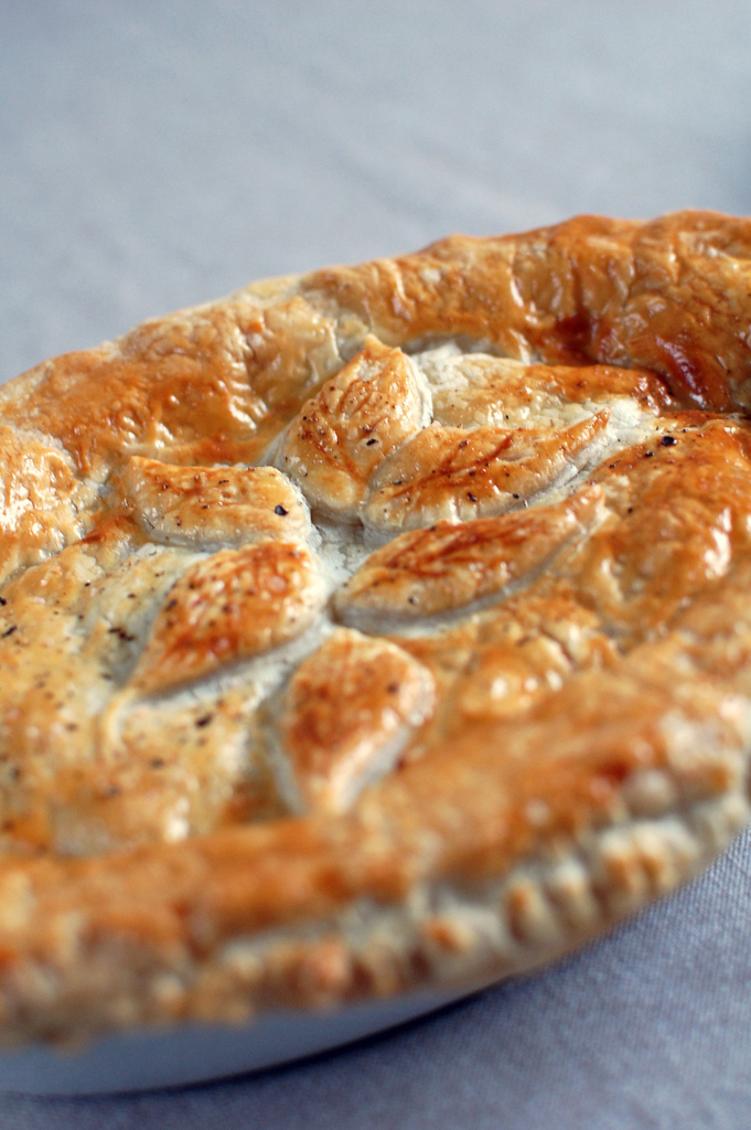 8. Quickly cover with the puff pastry. Trim and crimp the edges to form a seal, glaze with the beaten egg. Sprinkle with remaining thyme leaves and seasoning. You can decorate the top with bits of cut out pastry if you wish.