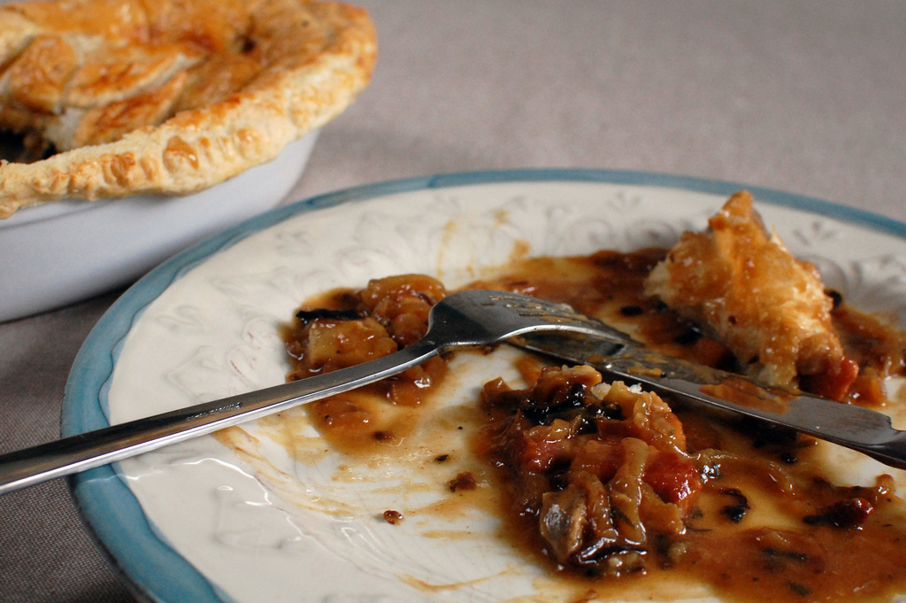 7. Transfer the sausage mix into the pie dish. Slowly, pour over enough gravy to come around a third of the way up; it shouldn’t be too sloshy).