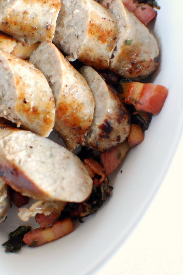 5. Remove from the heat. Once the sausages and onions have browned, remove them from the oven (the onions may need a few extra minutes on their own). Slice each sausage into four rounds and add to the bacon mix. Turn the oven down to 180c / Gas Mark 4.