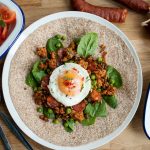 • Top the spinach covered wraps with a couple of spoonfuls of the cooked pork mix and several thin chorizo slices each. Then place a fried egg on top of each one. Scatter with the oregano and red chilli if using.