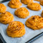 Simply pile mashed potato into a piping bag fitted with a wide star nozzle and pipe out some rosettes to bake in the oven. It’s that simple. If you were really scaredy cat you could cheat and just bake dollops of mash.