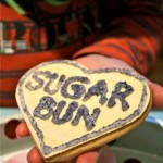 Cover of "Bake Me I'm Yours... Sweet Bitesize Bakes" by Sarah Trivuncic; image shows a selection of small cakes and patisserie. The book has a green polka dot spine edged with pink ribbon and a bow.