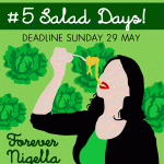 Cover of "Bake Me I'm Yours... Sweet Bitesize Bakes" by Sarah Trivuncic; image shows a selection of small cakes and patisserie. The book has a green polka dot spine edged with pink ribbon and a bow.