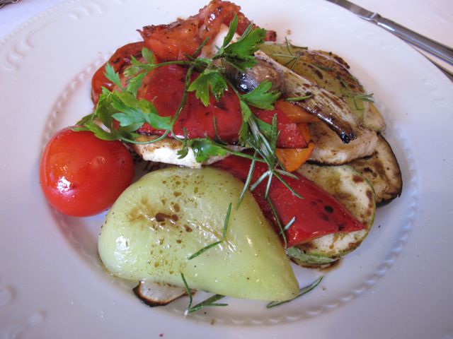 My mother in law is vegetarian and generally survives, when out of the house, on a side dish of grilled vegetables. Fortunately these tend to be substantial as you can see here.
