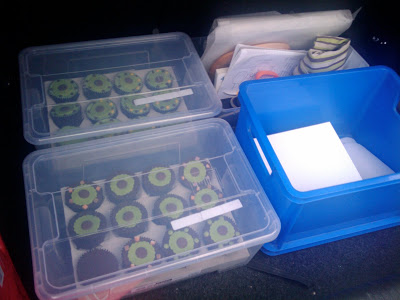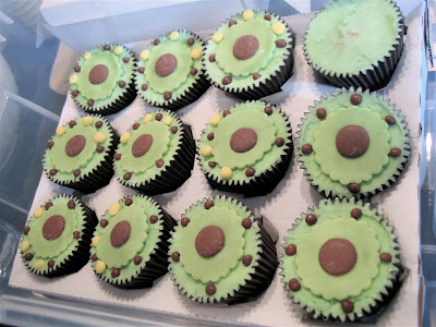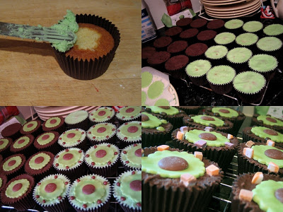 The cupcakes had chocolate icing and were decorated with more green fondant circles, chocolate buttons and chopped up dolly mixtures.  Both types of cupcake were in brown muffin cases from Asda. I’d started decorating the cupcakes before I went to bed but finished them in the morning.