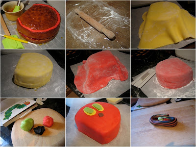 I have four packs of Dr Oetker ready to roll red icing each containing 125g of fondant in four colours.  I used most of the red fondant and over half of the yellow, about a quarter of the green but only a little bit of black.  The sponge cake was filled with buttercream and raspberry jam.