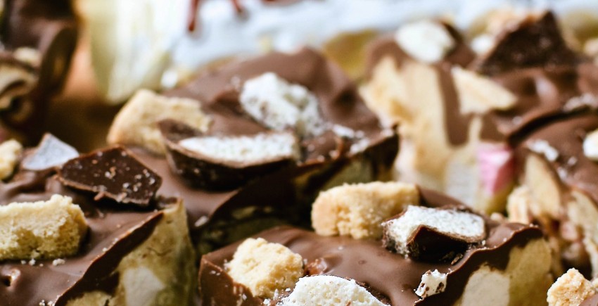Rocky roads or tiffins, those toothsome chunks of chocolatey biscuit studded with marshmallow. They are my nemesis in many a coffee shop and make a convenient no-bake tray treat to send in for school fetes and bazaars. There is an unnerving quantity of chocolate in these bars but they solidy chop down into bitesize pieces. … Continue reading White Aero Rocky Road