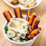 White bean hummus with homemade pesto with purple carrots - easy to make with canned beans or dried pulses as a summer appetiser, vegetarian bean dip or sandwich filling